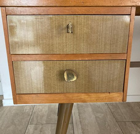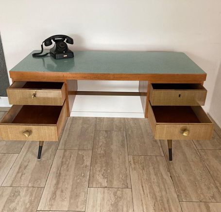 trotz seiner filligranen Erscheinung ist der Schreibtisch ein stabiles Möbel mit einem einzigartigen look 4 Schubladen bieten ausreichend Platz die obere Platte ist mit dem originalen mintfarbenen Resopal belegt und unterstützt so den„ true vintage look „ die Fronten der Schubladen sind mit Resopal in „ Holzoptik“ belegt 1 Schlüssel die hinteren Ecken sind abgerundet und lassen den Schreibtisch sowohl von hinten als auch von vorn gut aussehen